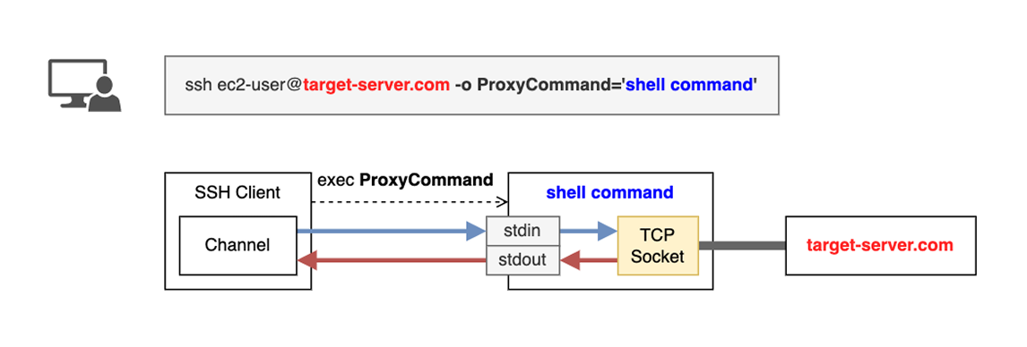 ProxyCommandtransmits user input from stdin to the target server. The target server's response is received and returned to the SSH client via stdout. This effectively establishes a bidirectional communication channel between the SSH client and the target server.