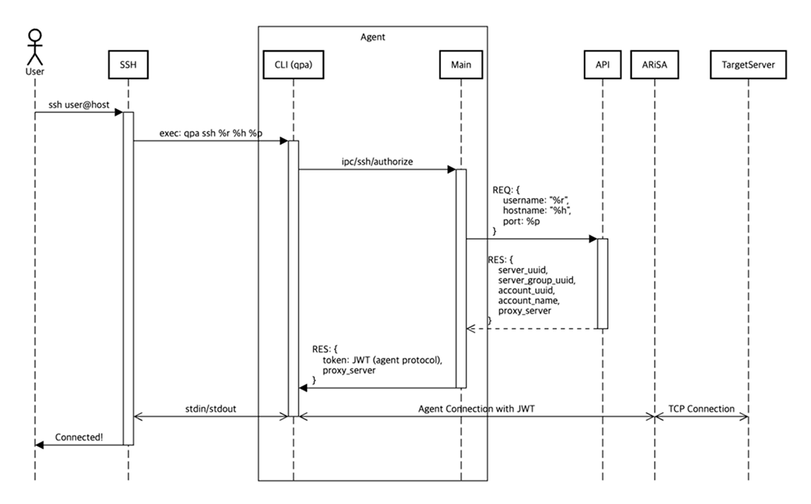 In Seamless SSH Connection, the qpa command used in ProxyCommand is an extended CLI version of the QueryPie Agent, a client-side agent that enables SSH access through QueryPie. The SSH client’s connection is tunneled through the Agent, allowing user authentication via the QueryPie system.