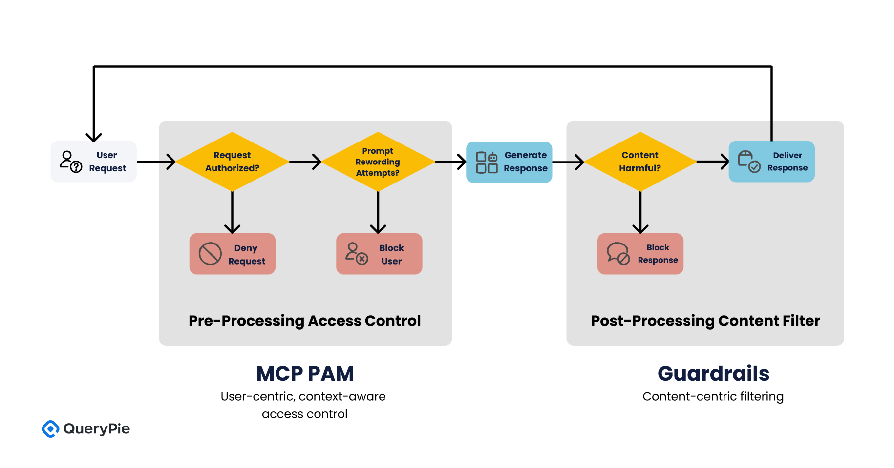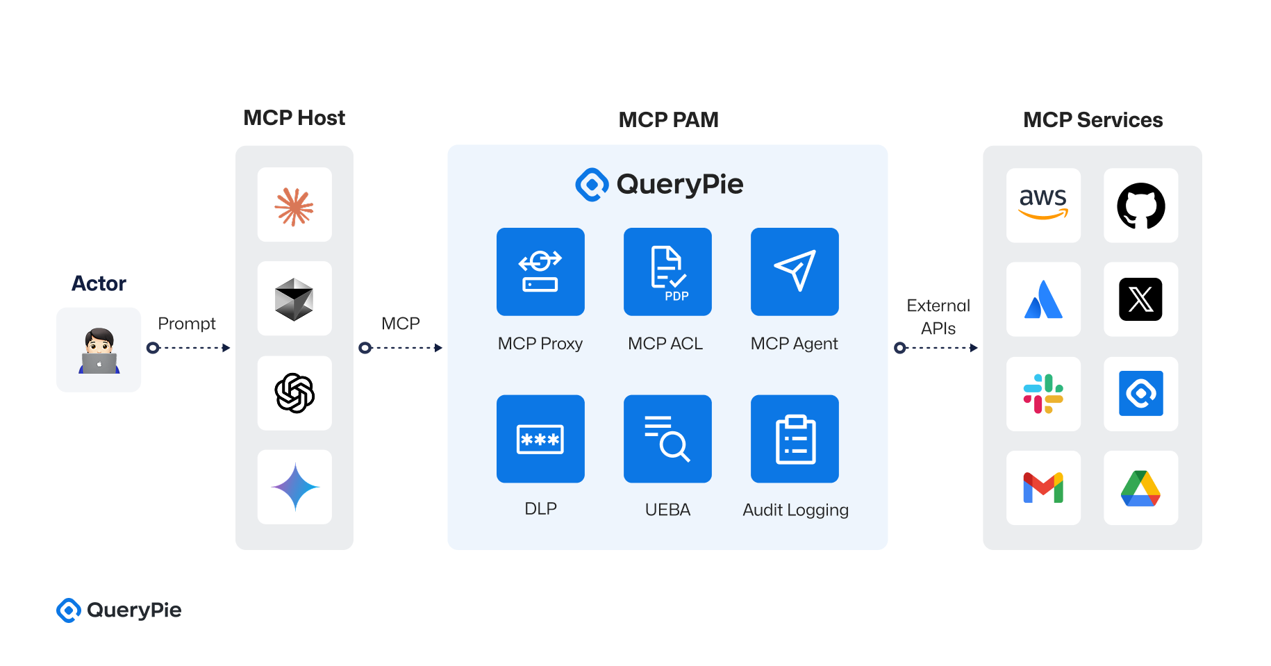 This white paper introduces QueryPie's MCP-based access control architecture, which integrates the principles of Privileged Access Management (PAM) to address these emerging challenges. By comparing this approach with solutions such as AWS Bedrock Guardrails, we demonstrate how these models can be complementary, not competitive—combining to create a comprehensive governance framework for AI automation.