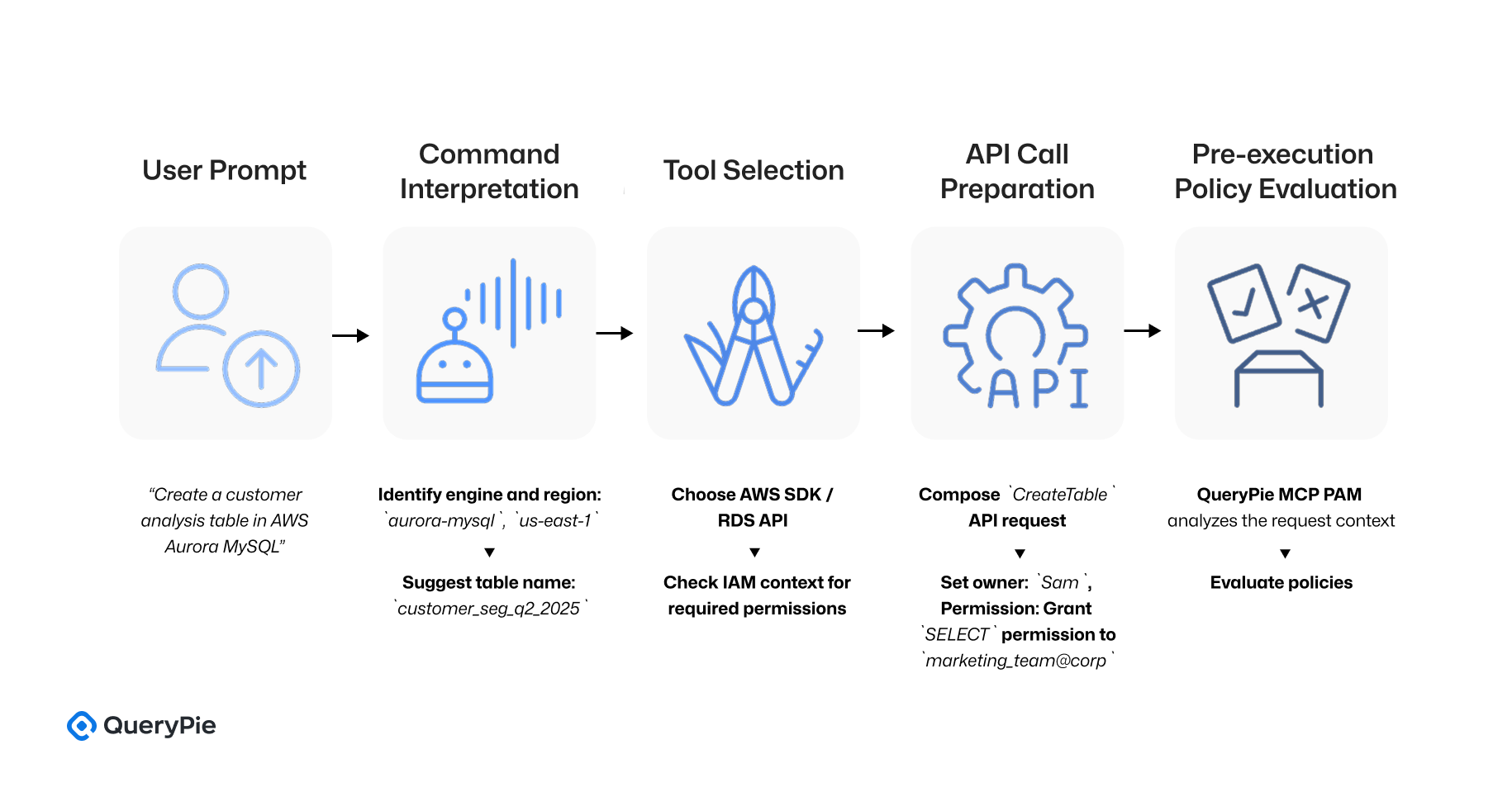 Traditional PAM systems operate by pre-authorizing specific actions, such as allowing a DevOps pipeline to create EC2 instances. This approach is effective when the tasks performed by scripts or automation tools are predictable and well-defined. However, QueryPie MCP PAM is engineered to manage the complexities of AI-driven requests, where user inputs are interpreted in natural language, leading to the generation of multifaceted execution sequences. For instance, when a user requests, "Create a table for marketing analysis," the AI might initiate a series of actions: